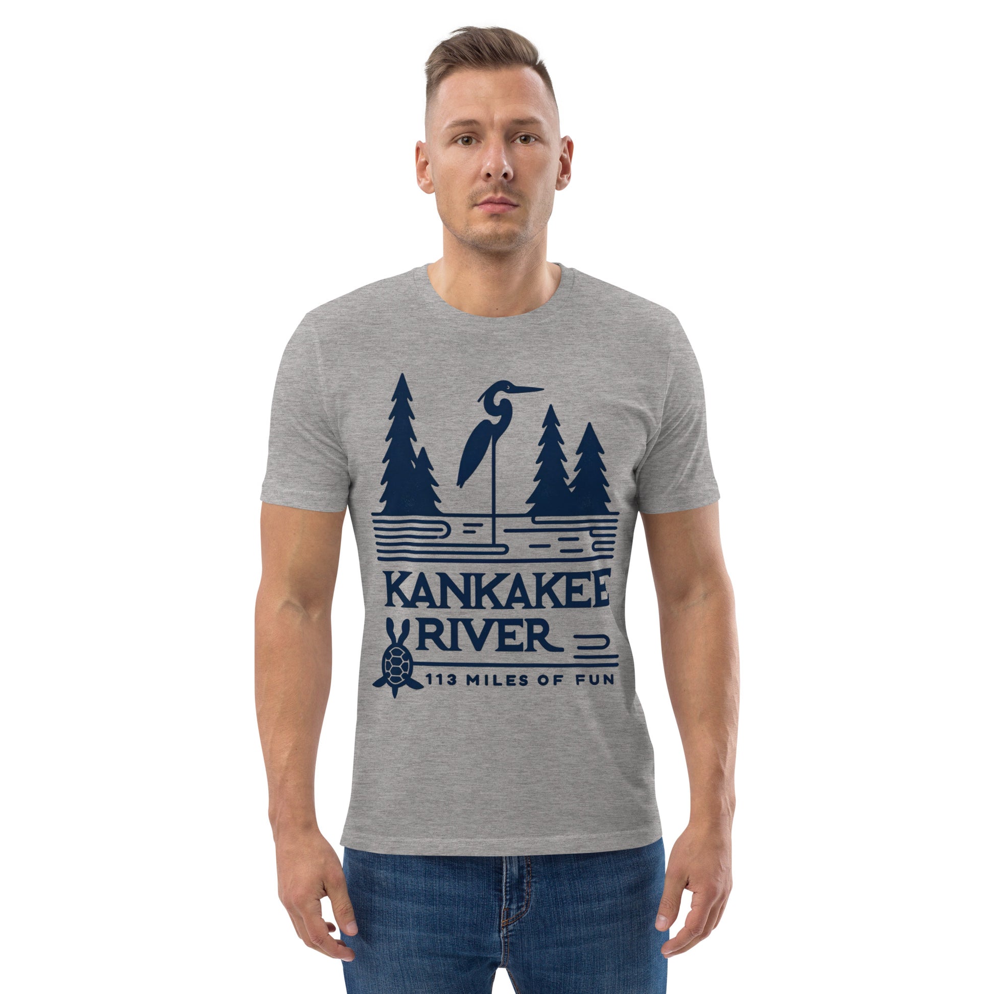 Celebrate the natural beauty of Illinois with this vintage Kankakee River t-shirt. Featuring an organic design with a blue heron, turtle, and pine trees, this gray shirt highlights the 113 miles of fun along the Kankakee River. Made from soft, organic fabric, it offers both comfort and style. Made from 100% organic ring-spun cotton, this unisex t-shirt is a total must-have. It's high-quality, super comfy, and best of all—eco-friendly.